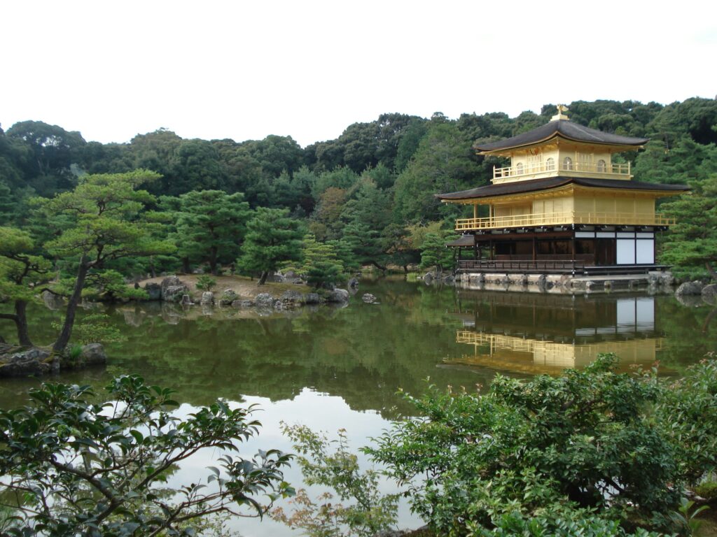 - Золотой павильон (Кинкакудзи). Этот храм, покрытый сусальным золотом, отражается в воде, создавая потрясающий контраст с зеленью окружающего сада. Особенно эффектно место выглядит осенью или зимой.